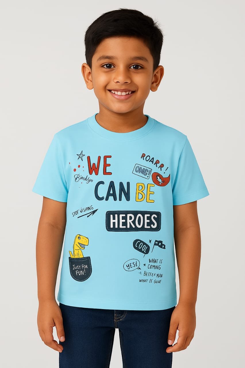 The tee features playful graphic prints with the slogan “WE CAN BE HEROES”, along with fun doodles and a cartoon dinosaur detail that kids will love. Its round neck and half sleeves provide a classic, casual fit perfect for outings, playtime, or daily wear.